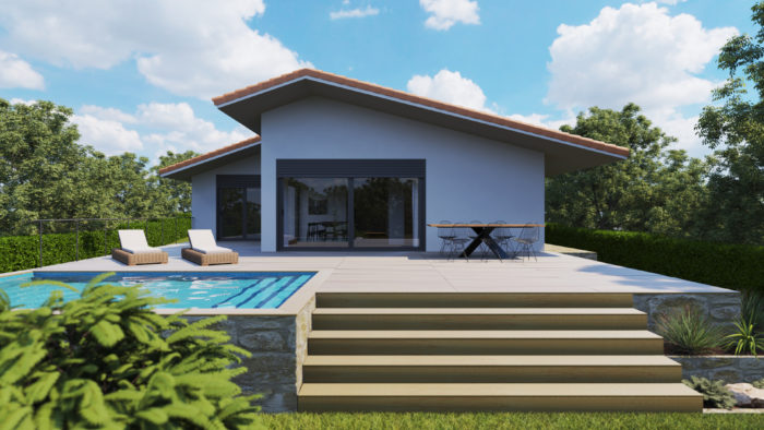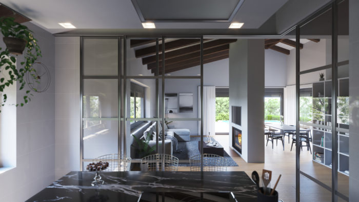 Ó salón-comedor posúe grandes ventanais que conectan ó interior co exterior, onde situamos unha piscina ó mesmo nivel, de xeito que a barreira do disfrute ten a posibilidade de diluirse, ademais de deixar un amplo espazo tanto na parte dianteira coma na traseira de xardín e aparcamento de vehículos.