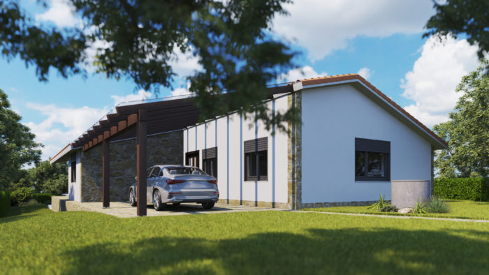 A fachada principal, ten un porche transparente no que poder aparcar ó vehículo en meses de intensas choivas e que á vez non impida a entrada de luz natural á vivenda. No interior, entramos a través dun vestíbulo que lévanos ó salón-comedor ou as zonas máis privadas coma son o baño, lavadeiro-tendedeiro e habitacións. Dividimos, por tanto, as zonas entre un uso diurno e un nocturno, que coinciden ca división das zonas máis privadas da vivenda.
